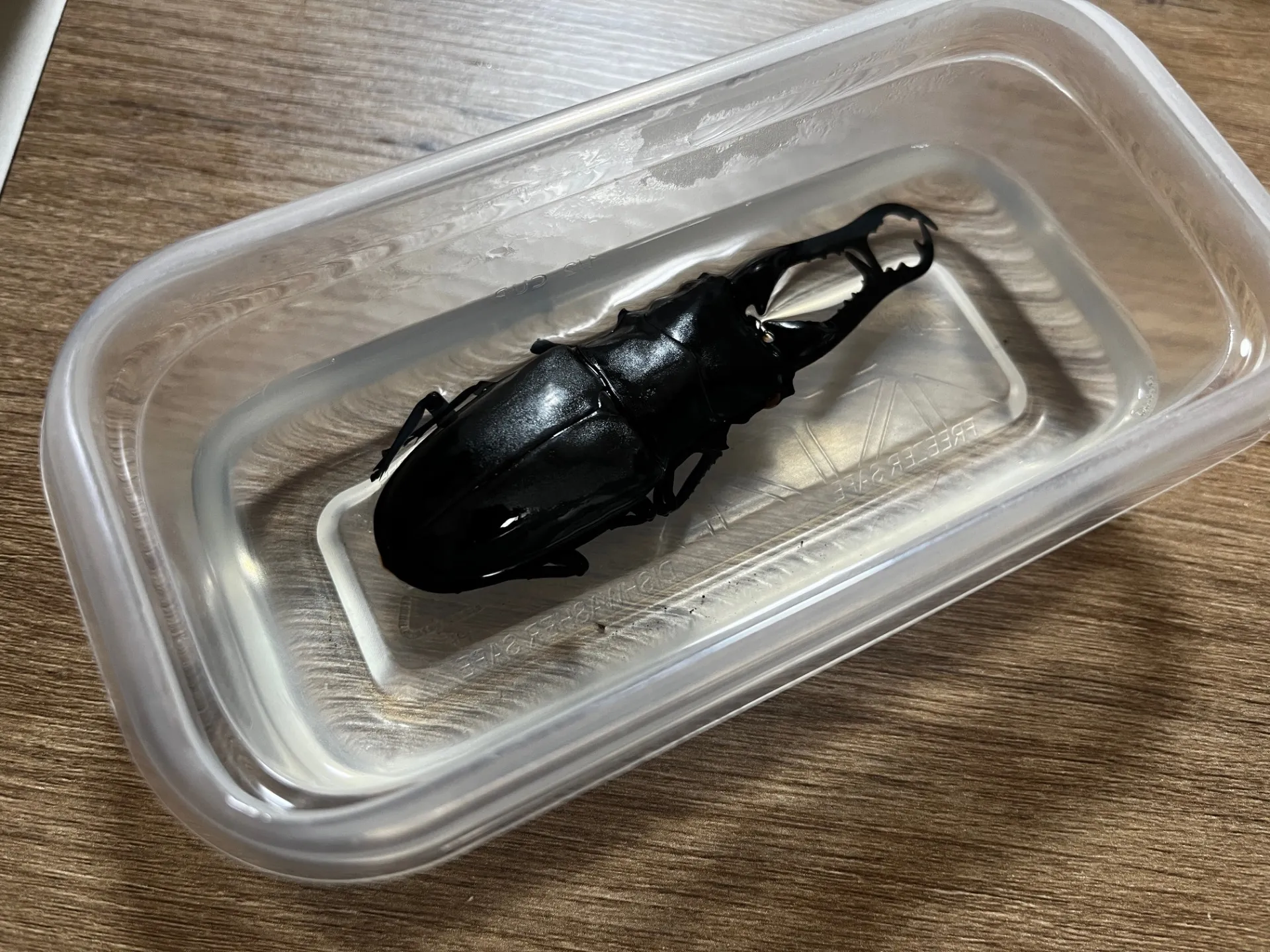 ここで初めてギラファが出てきました。大きい。あのアゴがめちゃくちゃ硬い!でこれ何してるのかというとお湯(70℃くらい)に入れて食器用洗剤を一滴(汚れ落とし)入れ、軟化させてます。